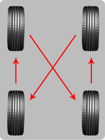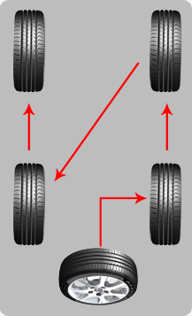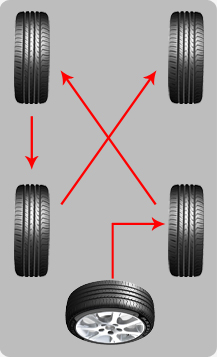 如果輪胎的磨損情況嚴重,建議使用如圖的方式交換前后輪胎,這樣可以使得所有輪胎保持大致相同的損耗。